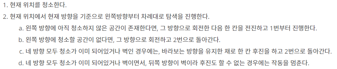 이 문제는 위의 작동 방식대로 로봇 청소기를 구현하는 시뮬레이션 문제였다.