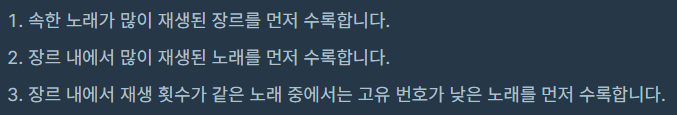 그 후, 장르별 재생 수 기준 내림차순, 노래 재생 수 기준 내림차순,